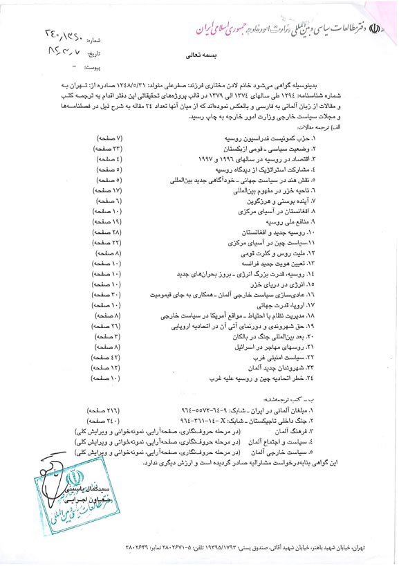 ٢٣. مختاري، لادن، علی رحمانی، حسین رضوي؛مبلّغان آلمانی, مجموعه مقالات آلمانی، مرکز چاپ و انتشارا ت وزارت امور خارجه، تهران ١٣٧٨، ٢١٢ ص.، واژه نامه ها و نمایه ffDiefdeutschenfMissionarefimfIran.