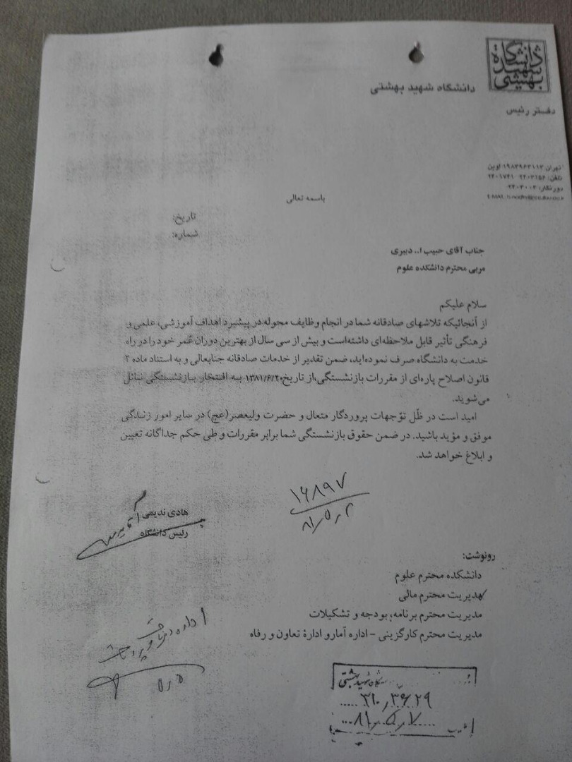 دراین حکم بازنشستگی آنچه باعث رضایت خاطر من را فراهم آورد که با هیچ معیار مادی قابل قیاس نیست این جمله است: «بیش از سی سال ازبهترین دوران عمرخودرادرراه خدمت به دانشگاه صرف نموده اید.»